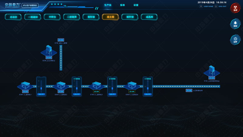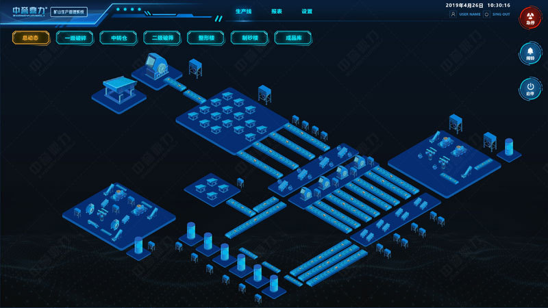 礦山生產(chǎn)管理系統(tǒng)三維形式展現(xiàn)整個(gè)生產(chǎn)線,可遠(yuǎn)程控制砂石骨料線的給料機(jī)、破碎機(jī)、皮帶機(jī)、制砂機(jī)、振動(dòng)篩等各設(shè)備的啟停,通過傳感裝置感知設(shè)備運(yùn)行狀態(tài)(如設(shè)備溫度、電壓、電流、振頻等數(shù)據(jù)),可監(jiān)測(cè)生產(chǎn)線產(chǎn)量、各儲(chǔ)料倉料位高度等信息,自動(dòng)生成報(bào)表,實(shí)現(xiàn)礦山生產(chǎn)環(huán)節(jié)的智能化操控管理及生產(chǎn)決策。