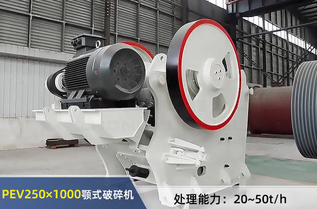 250×1000破碎機(jī)這里指PEV250×1000顎破,其出料粒度在25-50mm,每小時(shí)處理能力在20-50噸,同PEX250×1000細(xì)碎鄂破機(jī)一樣能做二破,用于細(xì)碎加工。