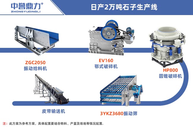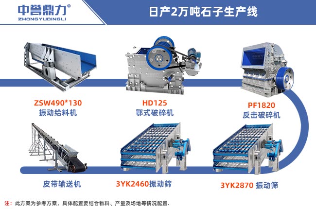 配置一條日產(chǎn)2萬(wàn)噸石子生產(chǎn)線需要用到給料設(shè)備、破碎設(shè)備、輸送設(shè)備以及篩分設(shè)備等配套設(shè)備,根據(jù)客戶不同硬度的物料,可以分多種配置方法,如下所示: