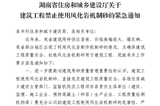 《關(guān)于建筑工程禁止使用風(fēng)化巖機(jī)制砂的緊急通知》中,為建筑工程質(zhì)量安,要杜風(fēng)化巖機(jī)制砂用于建筑工程。