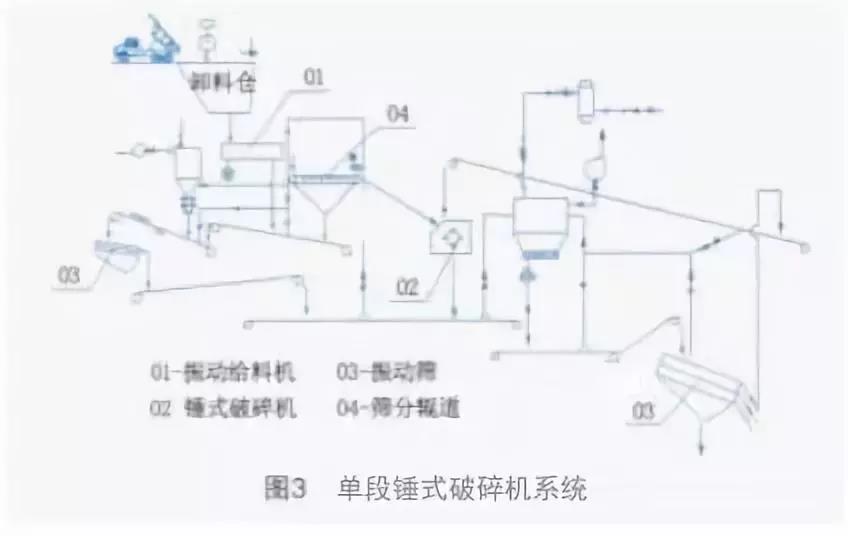 單段錘式破碎機(jī)系統(tǒng)由錘式破碎機(jī)和篩分系統(tǒng)組成見圖3。