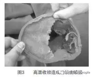 高溫?zé)煔鈱?duì)濾袋的另外一種損害是高溫收縮,雖然每種濾料的使用溫度不同,但當(dāng)煙氣溫度過(guò)其使用溫度后,如其經(jīng)向收縮率過(guò)大,會(huì)使濾袋在長(zhǎng)度方向上尺寸變短,濾袋袋底緊托著骨架并受力而損壞(如圖3)。如果濾袋緯向熱收縮過(guò)大,將使濾袋在徑向尺寸變小,濾袋會(huì)緊緊箍在骨架上,甚至無(wú)法抽出骨架。從而使濾袋處于受力狀態(tài),造成濾袋的收縮變形、變硬、變脆,加快強(qiáng)度耗損、減短濾袋壽命。由于濾袋變形后會(huì)緊緊箍在骨架上,在清灰時(shí)濾袋難以變形而不利于噴吹清灰,導(dǎo)致濾袋阻力居高不下。