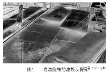 高溫對(duì)濾袋的損害是致命的。如黑龍江某煤粉干燥窯,由于干燥后煤粉顆粒細(xì)小又粘,清灰不理想,使濾袋表面存留大量的干燥后的煤粉,而這種干燥后的煤粉,燃點(diǎn)又低,當(dāng)高溫?zé)煔膺M(jìn)入除塵器后,會(huì)迅速點(diǎn)燃濾袋表面的煤粉,導(dǎo)致整臺(tái)除塵器的濾袋及骨架部被燒毀(如圖1)。從圖1可以看出,濾袋表面殘留大量的干燥后的煤粉,從其左上角也可見(jiàn)箱體被燒毀。