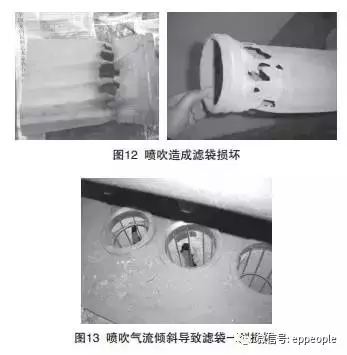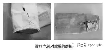 過(guò)高的過(guò)濾氣速會(huì)使粉塵沖擊、磨損濾袋,也會(huì)使 濾袋的織物纖維張力受損。除塵器的進(jìn)氣分布不均,容 易使高含量的大顆粒粉塵直接沖擊局部濾袋,造成廢氣 進(jìn)口處部分濾袋穿孔(如圖11)。