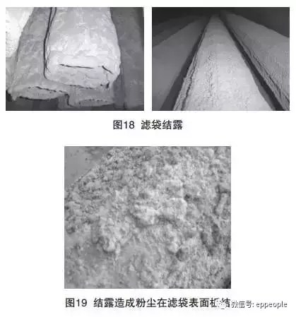 結(jié)露是袋式除塵器運(yùn)行中常見(jiàn)問(wèn)題(如圖18), 水分是濾袋結(jié)露的大原因,造成濾袋含有水分的原因 通常是低溫發(fā)生凝露,尤其在處理燃燒或高溫?zé)煔鈺r(shí),當(dāng)濾袋表面的初始粉塵層含有水分,干燥后就會(huì)使粉塵 凝結(jié)、板結(jié)(如圖19)。