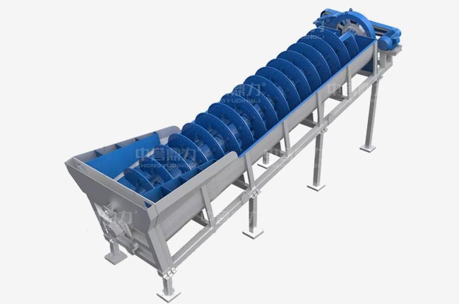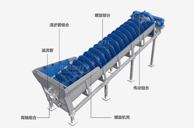 中譽(yù)鼎力螺旋洗砂機(jī)的結(jié)構(gòu)組成包括尾軸組合、螺旋機(jī)殼、傳動(dòng)組合、螺旋部分、清淤管組合、溢流管。