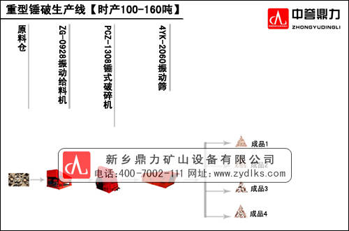 從山上爆破下來的石料,通過自卸車將600mm以下的石料送入振動給料機,振動給料機把石料均勻的送入重錘式破碎機,重錘破對石料進行破碎,通過圓振動篩分級篩分后,粒度不合要求的大塊物料通過輸送帶回到重錘破進行二段破碎,成品由皮帶機輸送至成品區(qū)。此石子生產線適合石灰石、青石、煤矸石、煤、礫石、片麻巖等抗壓強度不大于200Mpa的脆性物料,優(yōu)點是不需要如傳統(tǒng)的石子生產線一樣:鄂破+反擊破+圓錐破,只需要一臺重錘破就可以達到產量,破碎流程簡化,維護方便,節(jié)約生產成本。下面就100-160噸每小時的大產量石子生產線配置進行詳解。