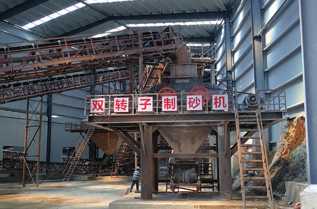 石灰石的粗碎選用1815型重錘式破碎機、破碎力度大,后經振動篩篩選,不符合要求的由二段1216破碎級進行整形破碎,再次經過振動篩篩分后,得到不同粒型的石子骨料,部分石灰石石子料經1218雙轉子制砂機細碎制砂,后經篩子篩分后可以的到粒型好的機制砂。