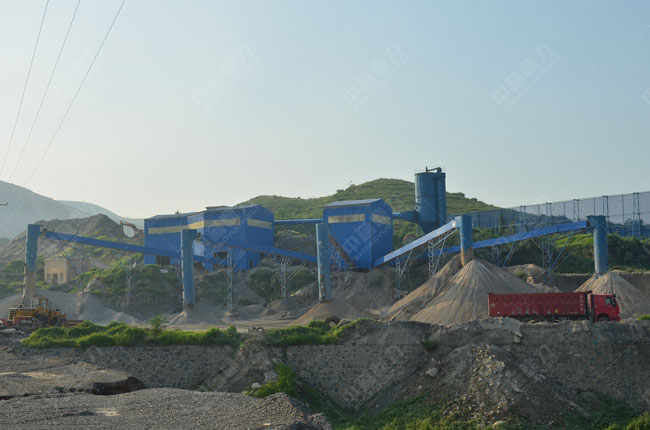 ZG1238振動給料機、PCZ1512重型錘式破碎機、2YK2060振動篩*2、DMCA脈沖除塵器*5臺等。在這條石料生產(chǎn)線中,物料先經(jīng)由重型錘式破碎機進行破碎,被破碎后的物料經(jīng)振動篩篩分分級,符合客戶粒度需求的成品物料被傳送至成品料堆,不符合的物料被重新送至破碎機機腔內(nèi)進行再次破碎。在每一個環(huán)節(jié)都配置有相應的除塵設備。這是一條封閉型的環(huán)保石料生產(chǎn)線。也是我們家砂石生產(chǎn)行業(yè)要發(fā)展的方向。