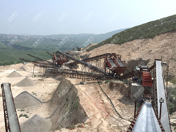 設備配置:振動給料機、顎式破碎機、雙轉子制砂機、圓振動篩、皮帶輸送機、除塵器等