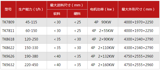 TK沖擊破碎機(jī)型號(hào)的多,常見的型號(hào)有TK7809、TK7811、TK8618、TK8622、TK9626、TK9632等等,下面臨這幾個(gè)型號(hào)的參數(shù)做詳細(xì)講解。