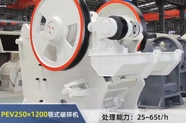 PEV250×1200顎式破碎機(jī)能破不大于210mm的物料,出料25-50mm之間,每小時(shí)產(chǎn)量在25-65噸,用的是37-45千瓦電機(jī),設(shè)備重8噸。
