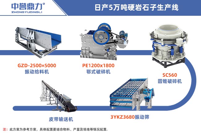 日產(chǎn)5萬(wàn)噸碎石投資方案設(shè)備搭配比較靈活,可以根據(jù)自己的物料屬性、資金狀況進(jìn)行合理選擇,下面以兩種常見(jiàn)的軟巖(石灰石、青石等)處理方案和硬巖(鵝卵石、花崗巖等)處理方案為列: