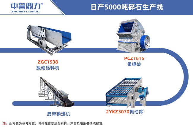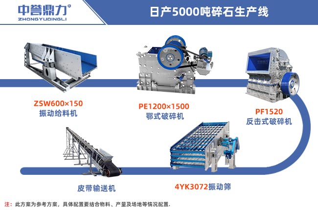 日產(chǎn)5000噸的生產(chǎn)線,時產(chǎn)量在620噸左右,其配置方案有好多種,設(shè)備配置比較靈活不固定,可以根據(jù)加工需求進行合理的選擇,常見的配置方案有鄂破+反擊破,還有單獨一臺重錘破的配置,具體詳情如下: