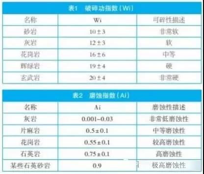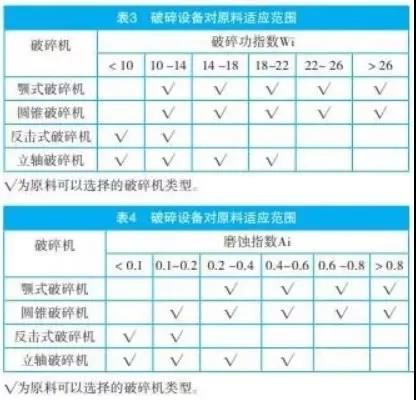 Wi:破碎功指數(shù)——物料破碎的難易程度,Ai:磨蝕指數(shù)——物料對(duì)機(jī)件的磨損程度,常見礦石的Wi和Ai見表1、表2。破碎設(shè)備對(duì)原料的適應(yīng)范圍見表3、表4。