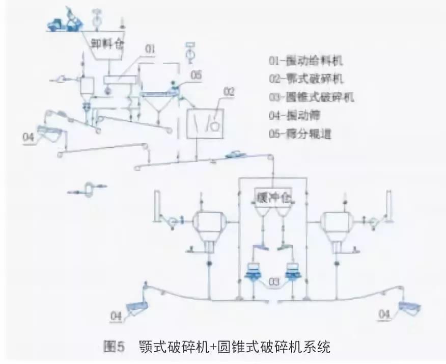 此系統(tǒng)由顎式破碎機(jī)、圓錐式破碎機(jī)和篩分系統(tǒng)組成見圖5。