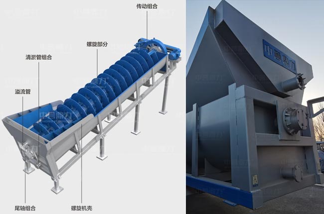 絞龍洗沙機(jī)水里那頭無傳動(dòng)組,屬于螺旋洗砂機(jī)的尾部,尾部軸承外置于水槽外,避免臟水污染軸承。整機(jī)傳動(dòng)組合在高處,通過電機(jī)和減速器帶動(dòng)軸承旋轉(zhuǎn),葉輪翻轉(zhuǎn)。