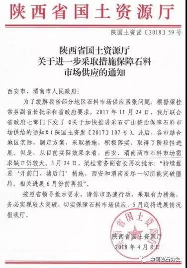 近日,陜西省土資源廳發(fā)布《陜西省土資源廳進(jìn)一步采取措施保障石料市場供應(yīng)的通知》,提到:目前,西安、渭南兩市石料市場需求缺口較大!锻ㄖ芬螅何靼埠臀寄弦M所能僵局,迅速行動,采取有力措施,務(wù)實現(xiàn)較大,切實保障石料市場供應(yīng),5月底將進(jìn)展情況報陜西省土資源廳。