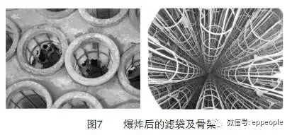 隨著袋式除塵器的普及,袋式除塵器粉塵爆炸事故也呈上升趨勢(shì)。如上海某鋼廠(chǎng)的干熄焦除塵系統(tǒng),由于前部阻火墻制造的問(wèn)題,造成火星進(jìn)入除塵器內(nèi)從而引起爆炸,將除塵器進(jìn)口管道盲板炸出幾十米遠(yuǎn),除塵器箱體嚴(yán)重變形。又如沈陽(yáng)某機(jī)制炭廠(chǎng),由于鋸末在炭化過(guò)程中產(chǎn)生大量的焦油和碳?xì)浠衔锏纫兹、易爆物質(zhì),而且焦油粘在濾袋上隨著時(shí)間推移越積越多,當(dāng)有火星進(jìn)入除塵器后就引起了除塵器爆炸。除塵器爆炸瞬間所產(chǎn)生的能量可使花板嚴(yán)重變形,濾袋爆裂情況見(jiàn)圖7。