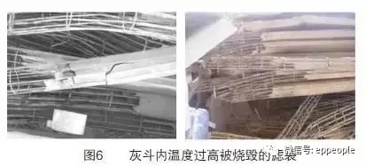 高溫粉塵被收入灰斗后,如果不能及時(shí)排出,粉塵會(huì)蓄積在灰斗里造成灰斗內(nèi)溫度不斷升高,濾袋在高溫烘烤下就會(huì)變脆、變硬,嚴(yán)重時(shí)則會(huì)燒毀,尤其是粉塵中含有的易燃物質(zhì),會(huì)在灰斗內(nèi)燃燒,從而燒毀濾袋(如圖6)。