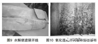 纖維氧化是纖維中分子失去(或離解)電子的過(guò)程,如PPS纖維,在高溫(150℃)條件下氧分子攻擊分 子中的“S”,并與之結(jié)合。造成PPS纖維變色、變硬、 變脆,強(qiáng)度而破損,嚴(yán)重時(shí)纖網(wǎng)會(huì)破碎而脫離基布 (如圖10)。氧化是濾袋損壞的又一主要因素。抗氧化 性能較差的濾料主要有:聚丙烯、聚苯硫醚(PPS)等。