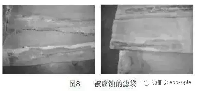 腐蝕損壞的痕跡多為放射狀,并在濾袋表面形成大面積變色,造成濾袋變硬、變脆并出現(xiàn)少量不規(guī)則圓周洞,但與火星燒穿濾袋產(chǎn)生的不規(guī)則圓周洞不同,是可用肉眼分辨出來(lái)的。圖8為河南某氧化鎂廠(chǎng)氯化工段的煙氣中的HCl含量高,PTFE濾袋平均使用壽命不到3個(gè)月,就被腐蝕得千瘡百孔無(wú)法繼續(xù)使用。所以,如果在此條件下進(jìn)行脈沖清洗濾袋,將會(huì)加速濾袋的損壞。