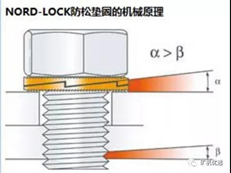 該防松墊圈由兩片墊片組成,外側(cè)是帶有放射狀凸紋面,內(nèi)側(cè)為斜齒面。當裝配時,內(nèi)側(cè)斜齒面間相對,外側(cè)放射狀凸紋面與兩端接觸面成咬合狀態(tài)。當連接件受到振動,并使螺栓發(fā)送松動趨勢時,僅僅允許兩片墊圈內(nèi)側(cè)斜齒面間相對錯動,產(chǎn)生抬升張力,從而達到100%的鎖緊效果。