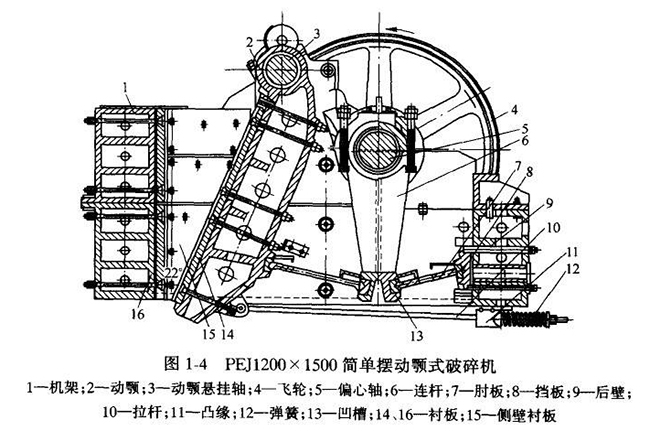 1、單擺顎式破碎機(jī)動(dòng)顎懸掛在心軸上,可作左右搖擺。2、復(fù)擺顎破機(jī)動(dòng)顎上端直接懸掛在偏心軸上,作為曲柄連桿機(jī)構(gòu)的連桿,由偏疼軸的偏心直接驅(qū)動(dòng),動(dòng)顎的下端鉸連著推力板支撐到機(jī)架的后壁上。當(dāng)偏疼軸旋轉(zhuǎn)時(shí),動(dòng)顎上各點(diǎn)的運(yùn)動(dòng)軌道是由懸掛點(diǎn)的圓周線(半徑等于偏疼距),逐步向下變成橢圓形,越向下部,橢圓形越偏,直到下部與推力板連接點(diǎn)軌道為圓弧線。