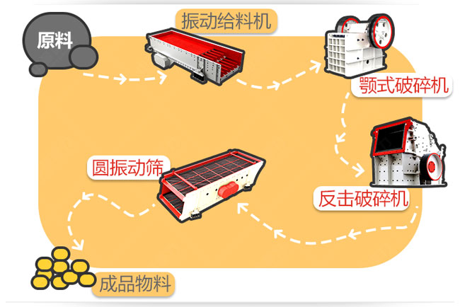 配置機械:重反擊錘式破碎機+震動喂料機+振動篩分設備+傳送機